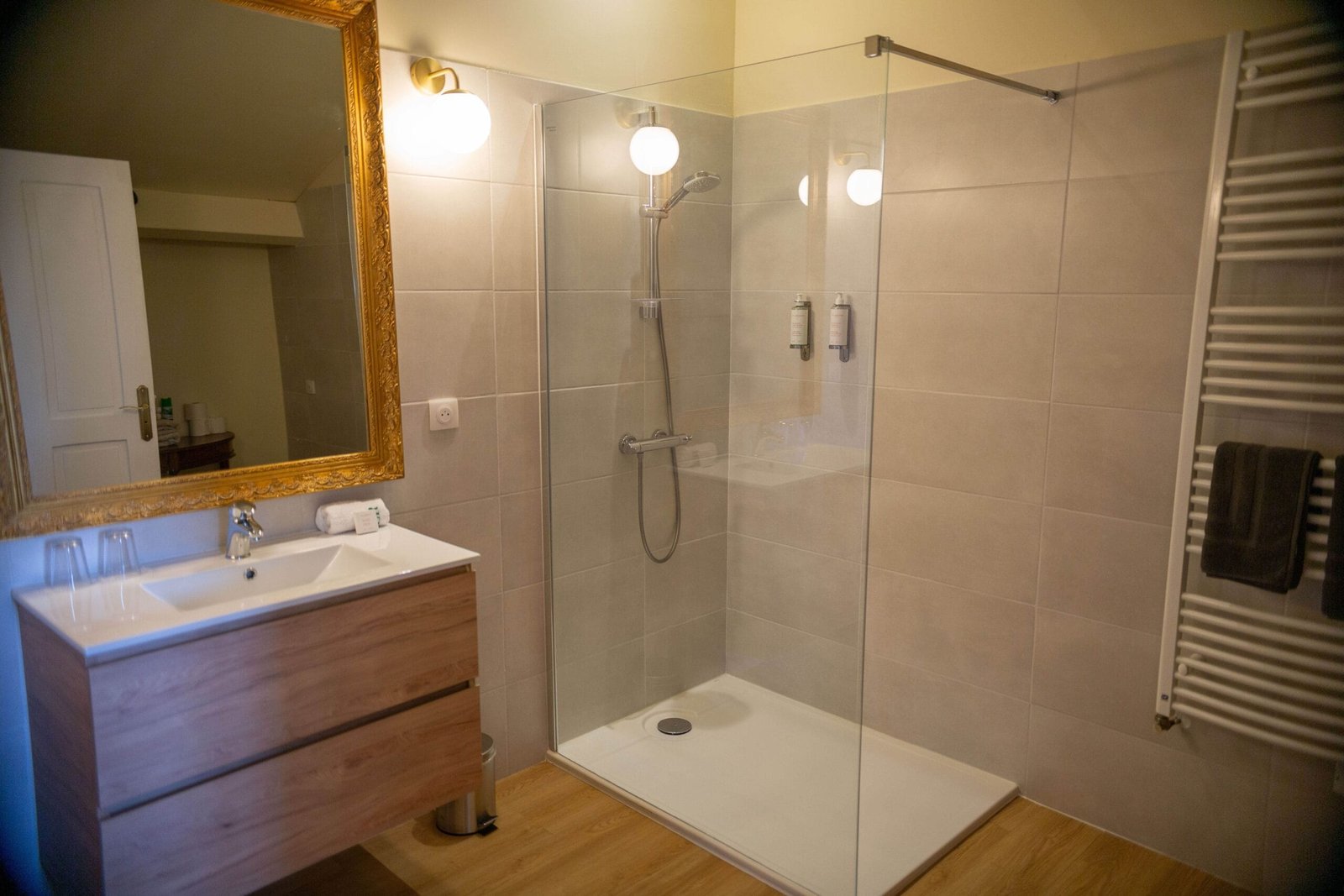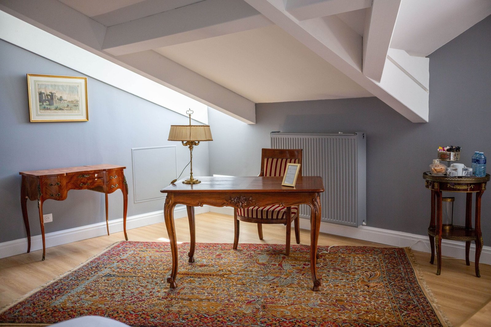 BLANCHE, la plus grande suite du Manoir avec plus de 50m², situèe en son centre au premier étage, bénéficie d’une luminosité apportèe par sa fenêtre en demi-lune, élement principal de la façade plein sud. Vous pourrez y admirer le parc en toute quiétude. Cette chambre avec son petit salon est équipèe d’un lit king size ou de deux lits simple, d’une grande salle de bain avec douche à l’italienne, meuble vasque et toilettes.